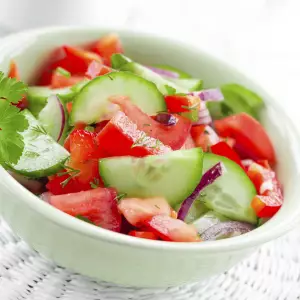 Куриное филе, жаленые шампиньоны, черри, лист салата, кунжут, соевый соус